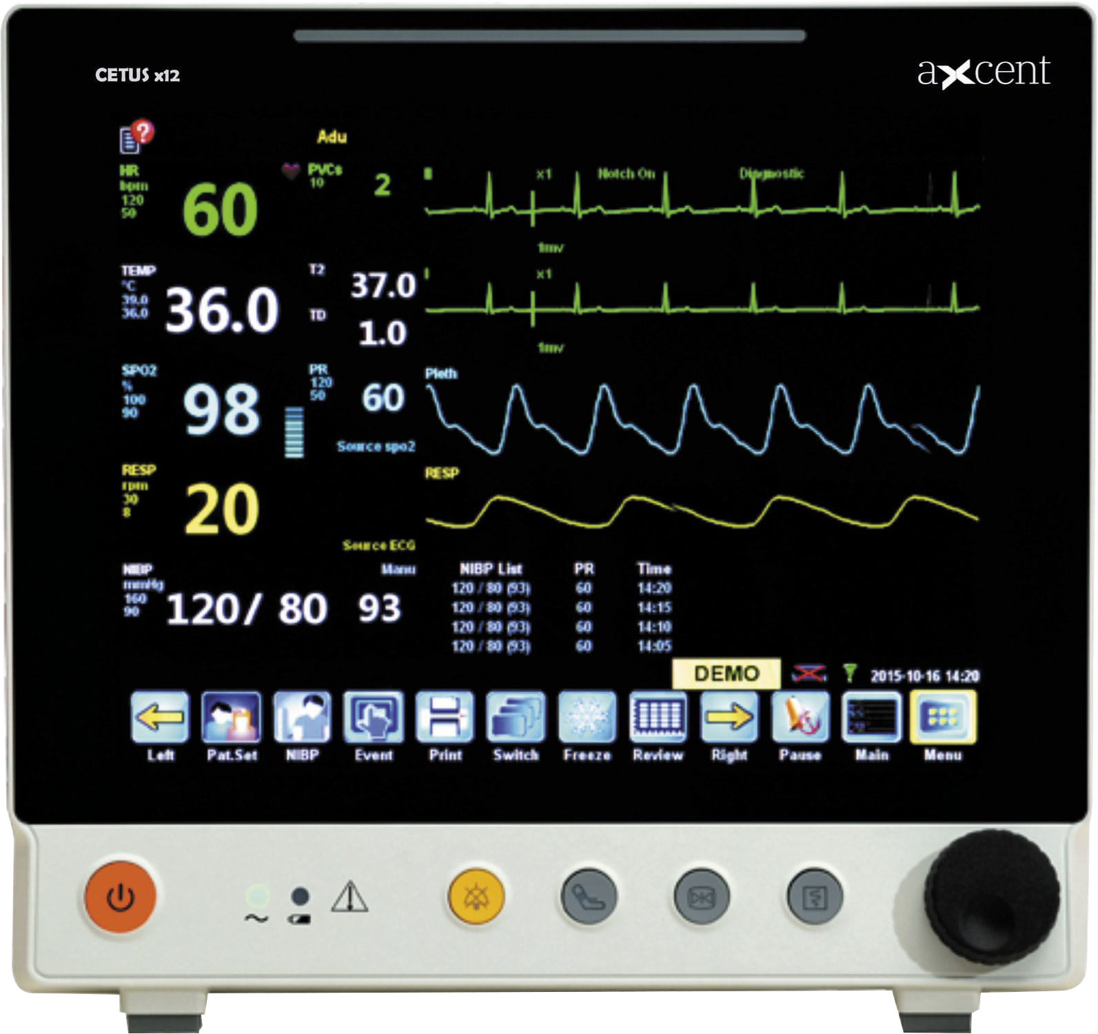 Touch-Screen, 12-lead ECG, Digital or Masimo SpO2, 2/4/6 IBP, Cardiac Output, EtCO2 Analyzer, Multi-Gas Analyzer, BIS, NMT, HDMI, Thermal Recorder, Wired/Wireless CMS